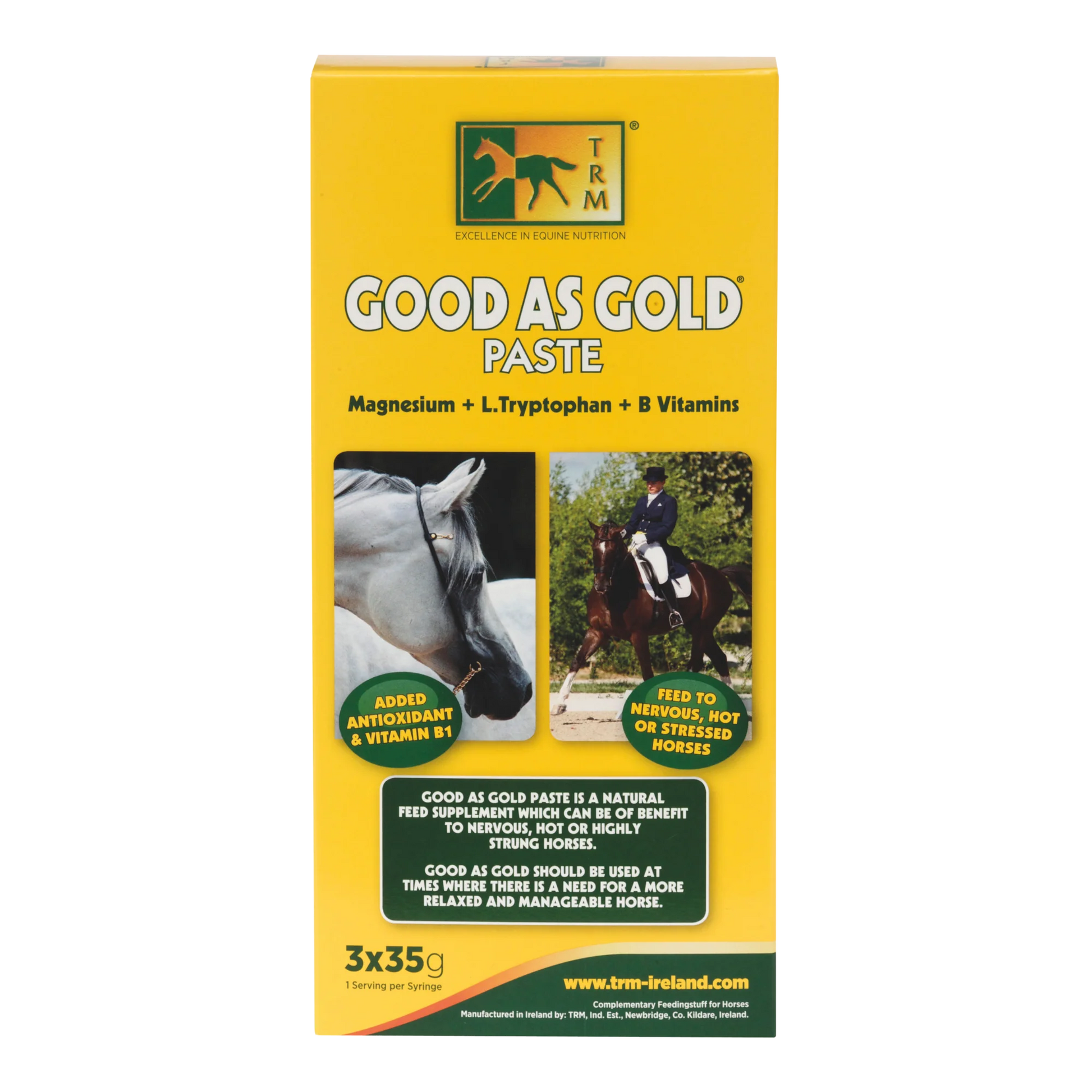 GOOD AS GOLD PASTE is a convenient complementary feed, specially designed for nervous, hot or highly strung horses. It contains a high level of magnesium which is in chelated form for better absorption, together with L.Tryptophan and B Vitamins.